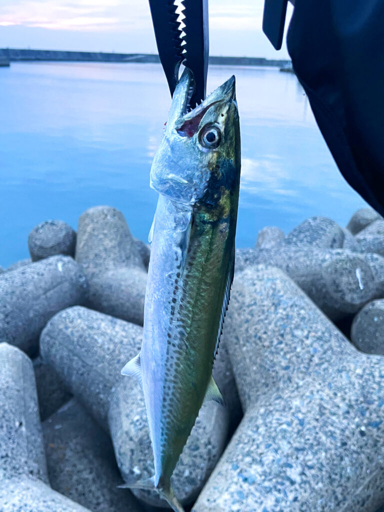 17時くらいになってきたらボイルがあちこちで激しくなってきた。足場を港側にジグサビキで軽く投げ、ジャーク&フォールしてみたらすぐにヒット。引きが強烈でなんだろうと寄せてきたらサゴシだった。一帯ののボイルは主にサゴシの模様。水面から4mくらいを一気に抜きあげ、ガーグリップで口をつかんで手尺40cmくらい。ハサミで脳締め・血抜きのエラぱっちんして海水を汲んだバケツに頭から突っ込む。