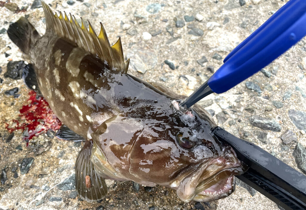 こないだと同じように慌てず足場を変えて軽く引いたり緩めたりしていると動き出したタイミングでグイーッと引いて浮かせ、少し泳がせて弱らせてから抜き上げた。40cmくらいありそうなマハタだ!かなり重かったがバス釣りの時は50cm超えでも何度も抜きあげたことがあるのでまだ少し余裕あり(帰宅後、マハタは37cmだった)。