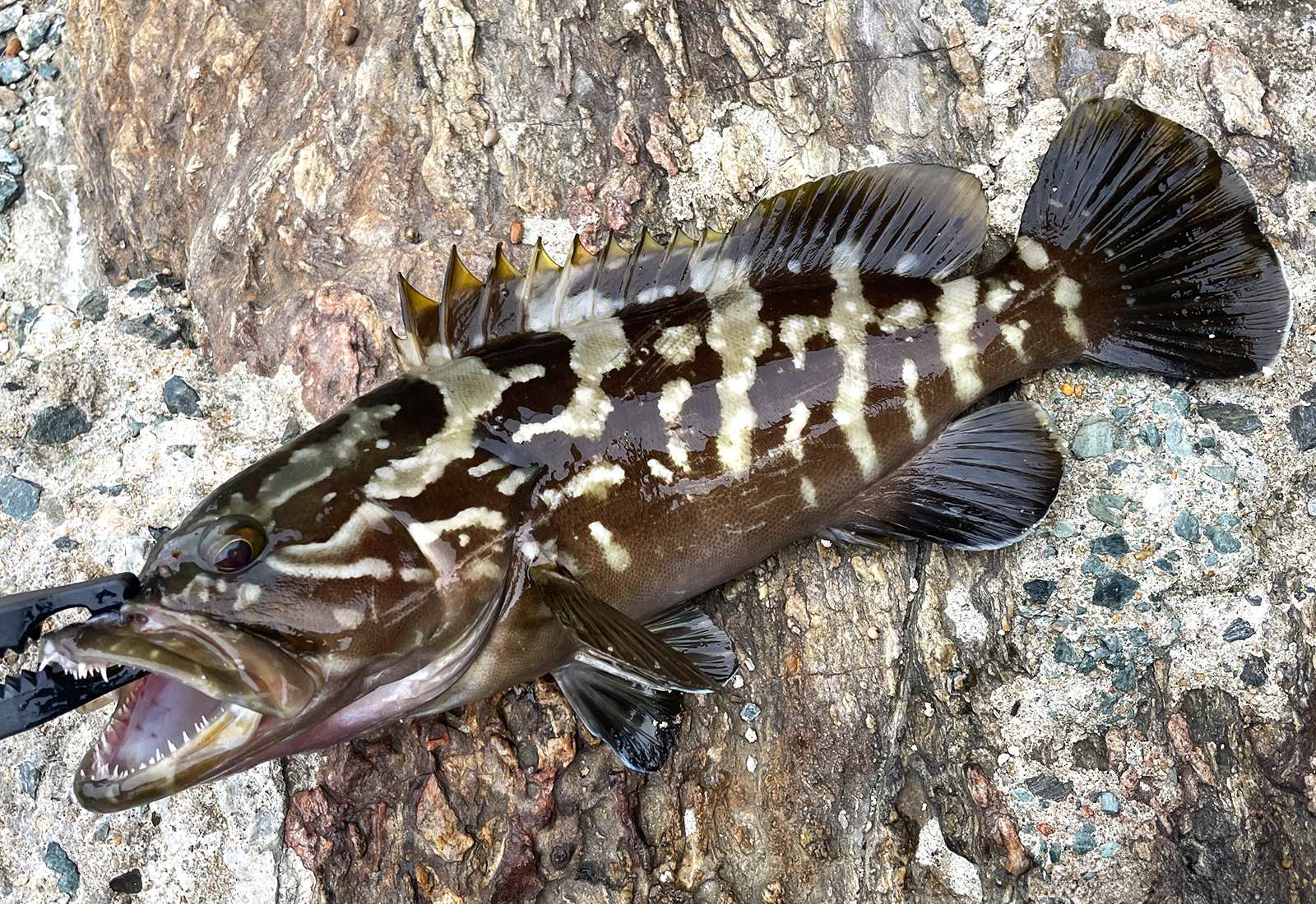 こないだと同じように慌てず足場を変えて軽く引いたり緩めたりしていると動き出したタイミングでグイーッと引いて浮かせ、少し泳がせて弱らせてから抜き上げた。40cmくらいありそうなマハタだ!かなり重かったがバス釣りの時は50cm超えでも何度も抜きあげたことがあるのでまだ少し余裕あり(帰宅後、マハタは37cmだった)。