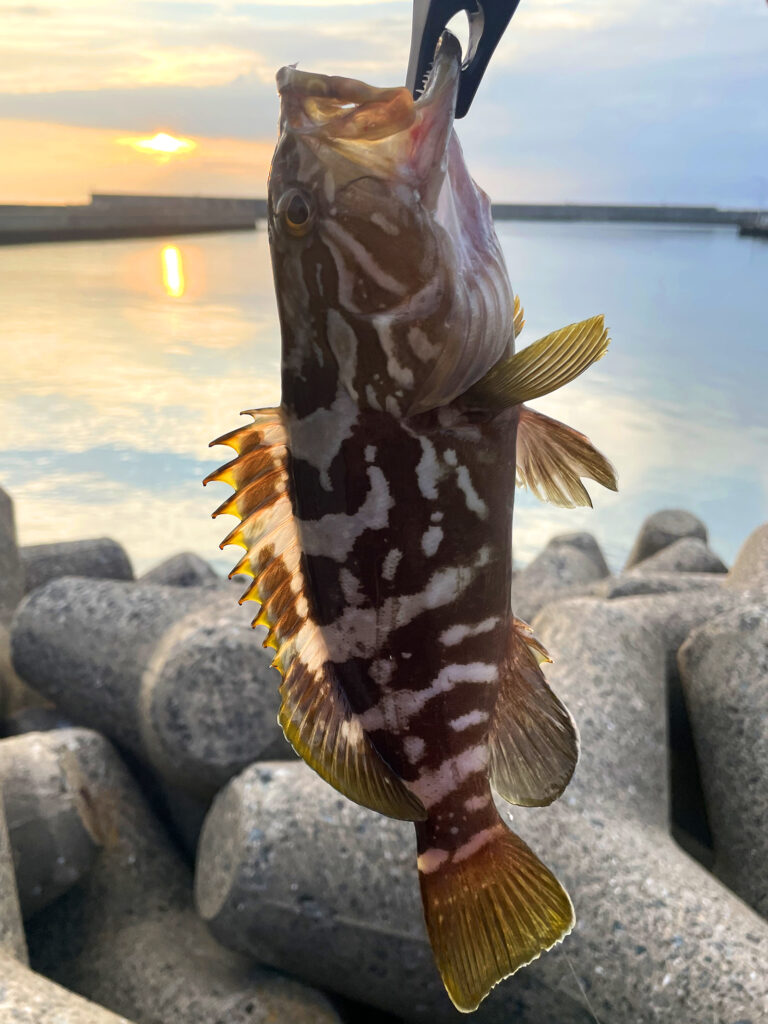 おそらくエソだと思われる反応が何度かかったがもう日暮れ、そろそろ帰ろうかと思っていた時だ。ジャーク&フォールで水中の大きな岩の脇にさしかかり、ジグがフラフラ落ちていると底から大きな魚体がドン!食った!と思ったら強烈にぐいぐい引く。一瞬姿が見えハタだ!と思ったら岩の根に潜ってしまった。そこからうんともすんともどうにもならないので引きづりやすい方向に立ち位置をかえ、一旦ラインの張りを緩ませたり軽く引いてみたりしていると再び動き出したので、すかさず力を入れてググッときたらまた根に入られ、を繰り返しているうちになんとか引き摺り出すことに成功。バス釣りの時みたいにロッドを操作して水面付近を右に左に泳がせて弱らせ、引きが弱くなったところを一気に抜きあげた、やったー。初めてハタを釣った。